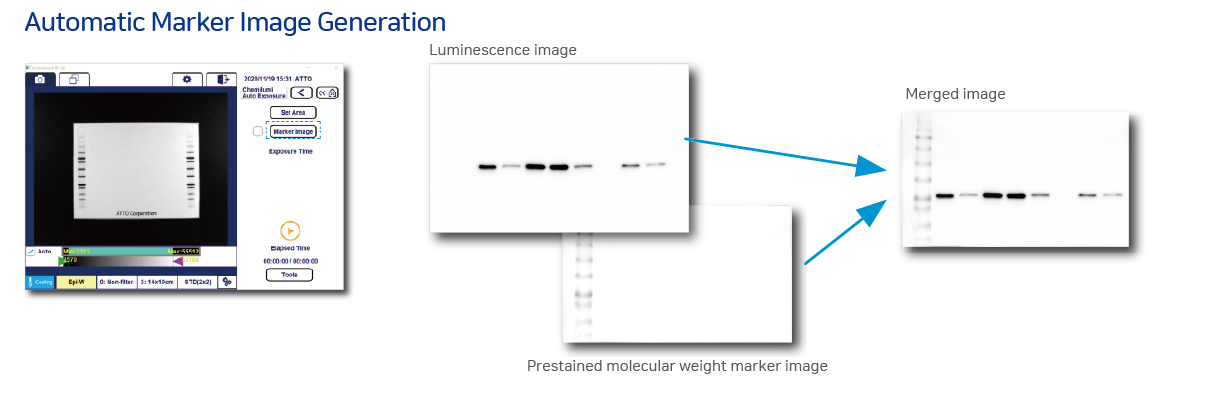 - By simply clicking the ‘Marker Image’ button, a prestained molecular weight marker image will be automatically captured while taking a chemiluminescence image, and a composite image will be automatically created with the chemiluminescence image.