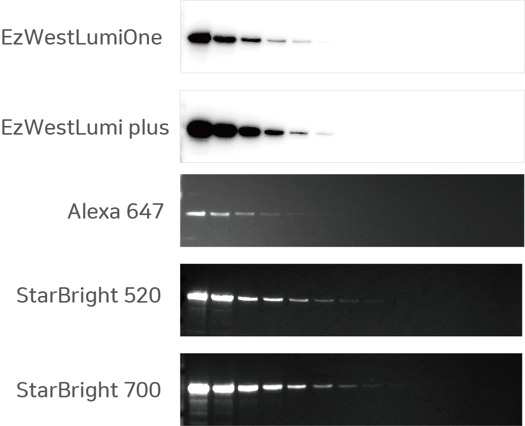 - The results of Western blotting with an anti-transferrin antibody are shown for transferrin protein electrophoresed in a 1/2 dilution series, starting from 10 ng per lane. The images were captured using luminescence photography after reaction with an HRP chemiluminescent substrate, or fluorescence photography using an RGB light source.