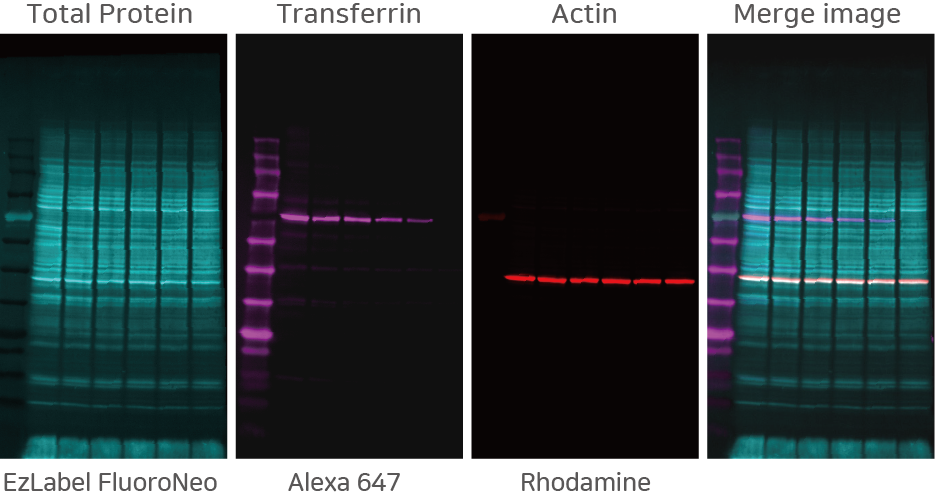 Sample: Mixture of HeLa cell extract with added transferrin EzLabel FluoroNeo-labeled HeLa cell extract (20µg/all lanes) Human Transferrin (10, 7.5, 5.0, 2.5, 1.0, 0 ng/lane from left)