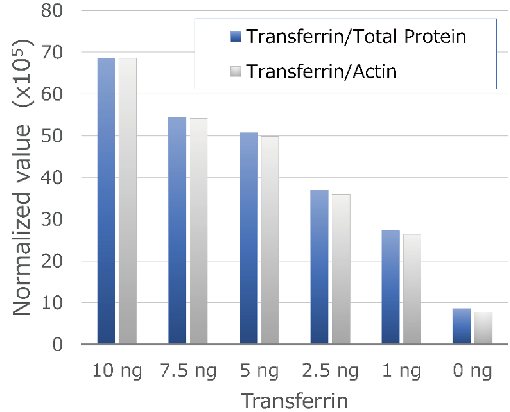 - The results are shown for HeLa cell extract protein samples with 0 to 10 ng of transferrin added per lane, which were electrophoresed using u-PAGEL H. After the Western blotting reaction, the results were captured using the LuminoGraph Ⅲ Lite. The graph shows the results of normalizing the transferrin amount based on the signal values of total protein and housekeeping protein (actin) after analyzing each image using CSAnalyzer 4.