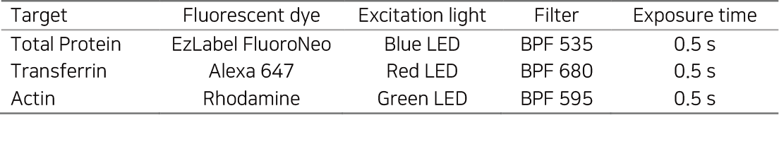 - The images shown are of gels fluorescently labeled with EzLabel FluoroNeo or stained with CBB (EzStain AQua), using the indicated light source and filter combinations. The CBB-stained gels were then colorized using CS Analyzer.