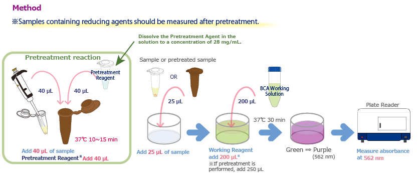 | Sample Volume | *Working Reagent Mix BCA Reagent A and B at a ratio of 50:1 immediately before use. *Standard Assay Protein sample: 25 µL/well Working reagent: 200 µL/well Incubate at 37°C for 30 minutes. *Low-Concentration Assay Protein sample: 25 µL/well Working reagent: 200 µL/well Incubate at 60°C for 30 minutes. |