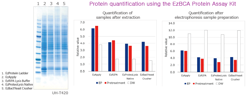 These results demonstrate that protein quantification using the EzBCA Protein Assay Kit with pretreatment shows a high correlation with electrophoresis-based analysis.